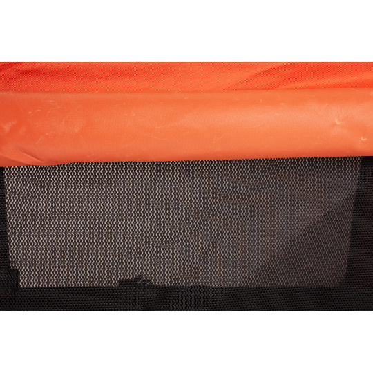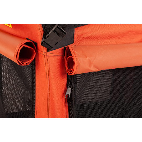 Špeciálna pevná tkanina, odolná sieťovina je použitá vo všetkých oknách a vchodoch - jeden zpredu, druhý zboku. Vchody aj okná je možné zatemniť roletkou z rovnakého materiálu, ako je celý box. Záťažové zipsy zaisťujú jednoduchú manipuláciu a dlhú trvanlivosť. Dverové pracky zaručujú, že Váš pes neotvorí zips zvnútra.