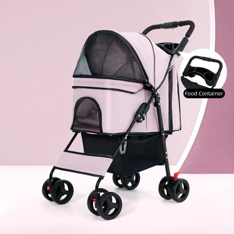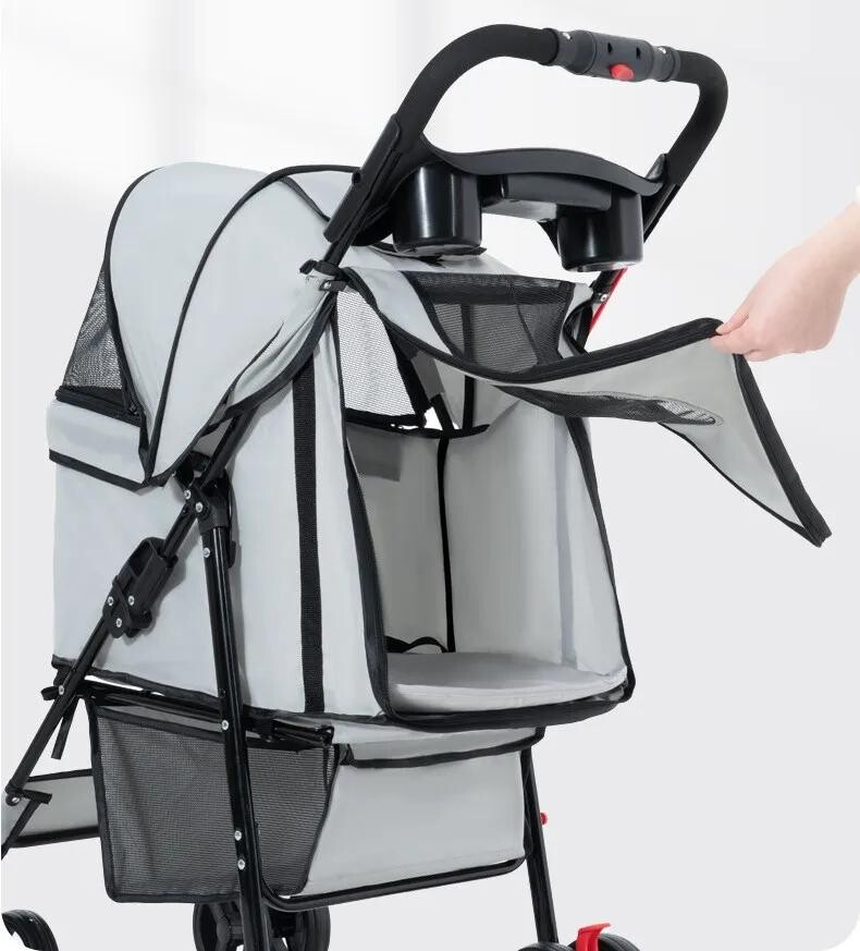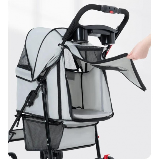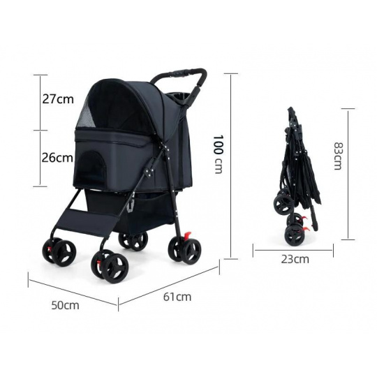 Kočárek je možno snadno složit, mají větrací mřížku, zajistitelná kolečka a stahovací střechu. Aby Váš pejsek za jízdy nevyskočil, je možné kočárek kompletně uzavřít síťkovaným krytem. Kočárek je možno zatížit do cca 30 kg.