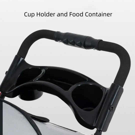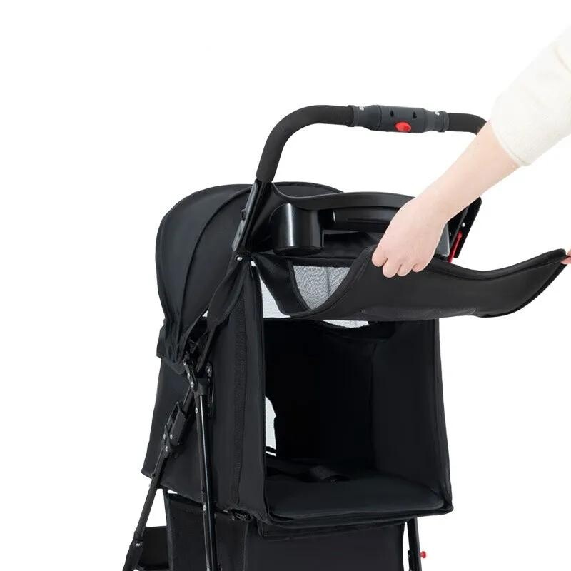 Přední část kočárku je možné kompletně otevřít pomocí zipsu. Do rukojeti jsou integrovány praktické držáky, např. na láhev, nebo na pamlsky pro Vašeho mazlíčka. Další úložné prostory nabízí uzavíratelná kapsa v zadní části kočárku a síť na spodní straně kočárku.