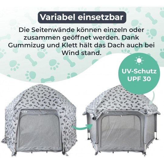 Pre vnútorné aj vonkajšie použitie: ohrádka pre domácich miláčikov PETY je vhodná pre rôzne použitie a rôzne domáce zvieratá. Spodná časť je odnímateľná a prateľná vďaka zipsu. Vhodné aj pre veľké plemená.